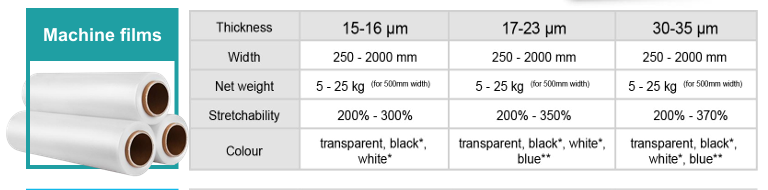 Machine stretch films are dedicated to all types of wrapping machines. They allow express and automated wrapping of loads. They are used in production and logistics companies. Thickness 8-9 um 10-11 um 12 um Width 250-2000 mm 250-2000 mm 250-2000 mm Net weight 5-25kg (for 500mm width) 5-25kg (for 500mm width) 5-25kg (for 500mm width) Stretchability 120% – 180% 120% – 200% 150% – 250% Colour transparent transparent transparent Thickness 15-16 um 17-23 um 30-3...